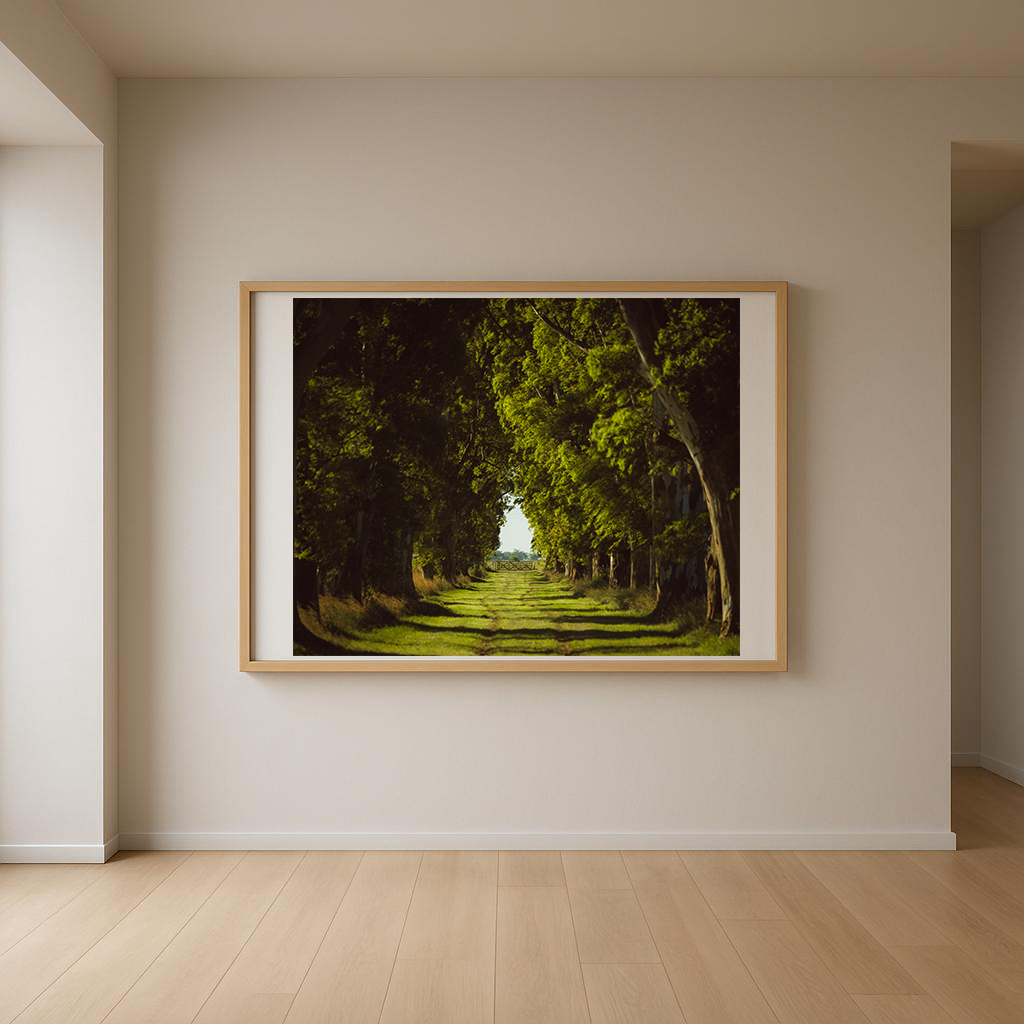 Fotografía horizontal de Félix Gómez Roca que muestra un bosque denso, organizado a partir de dos filas de árboles enfrentados que abren un camino central. La composición conduce la mirada hacia el fondo de la imagen, donde aparece una tranquera pequeña y lejana, casi perdida en la profundidad del paisaje. La repetición de los troncos genera un ritmo visual marcado, mientras el sendero funciona como un eje de tránsito y expectativa. La tranquera, apenas visible, introduce una pausa y un punto de tensión: límite, paso o espera. La imagen propone una experiencia de silencio, orden y distancia, donde el paisaje se vuelve estructura y contemplación.