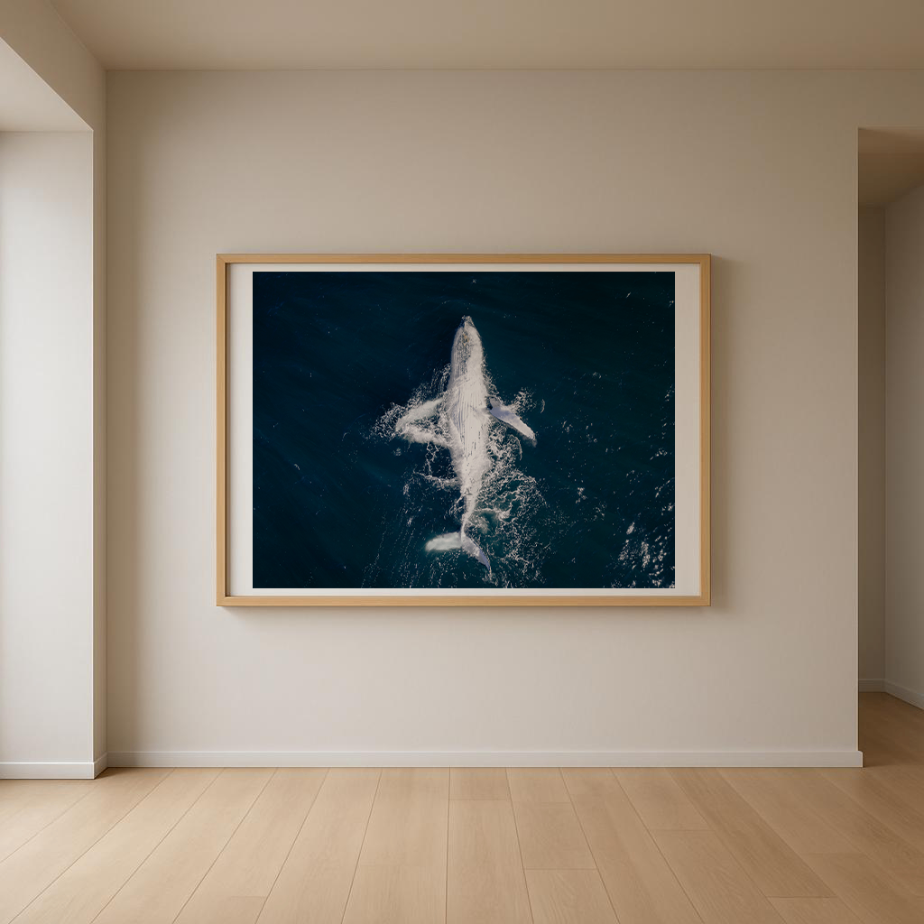 Fotografía horizontal tomada desde una perspectiva aérea, donde la ballena aparece completamente invertida, mostrando la totalidad de su vientre blanco bajo la superficie del agua. El cuerpo, visible en su extensión, flota como una forma clara y continua que contrasta con los tonos profundos del mar, generando una imagen de fuerte impacto visual. La ausencia de referencias espaciales y la vista cenital transforman al animal en una presencia casi abstracta, más cercana a un paisaje que a un retrato naturalista. La blancura del vientre emerge como un campo luminoso que atraviesa el agua, evocando fragilidad y grandeza al mismo tiempo. La obra forma parte de la colección “Ballenas” de Félix Gómez Roca, donde la mirada aérea convierte el gesto natural del animal en una imagen contemplativa y silenciosa.