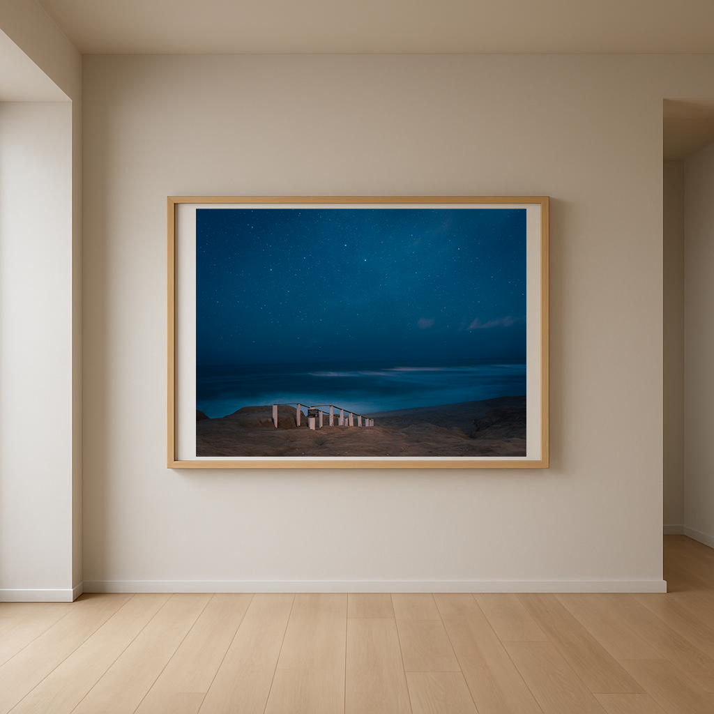 Fotografía nocturna de Félix Gómez Roca que muestra un paisaje costero bajo un cielo intensamente estrellado. El mar aparece difuso y en movimiento, fundiéndose con los tonos profundos de la noche. En primer plano, una estructura simple sobre la arena avanza hacia el océano y se detiene, marcando un límite sutil entre lo humano y lo natural. La imagen transmite silencio, amplitud y contemplación.
