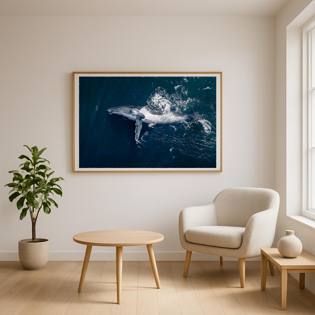 Fotografía horizontal tomada desde una perspectiva aérea, que muestra a una ballena vista desde arriba, desplazándose de costado mientras parte de su cuerpo emerge suavemente a la superficie del agua. El contraste entre la masa orgánica del animal y la textura cambiante del mar genera una sensación de calma, escala y silencio. La imagen enfatiza la relación entre el cuerpo de la ballena y el espacio que la rodea, transformando el instante en una composición casi abstracta. La obra forma parte de la colección “Ballenas” de Félix Gómez Roca, donde la mirada elevada revela la presencia majestuosa del animal en su entorno natural.